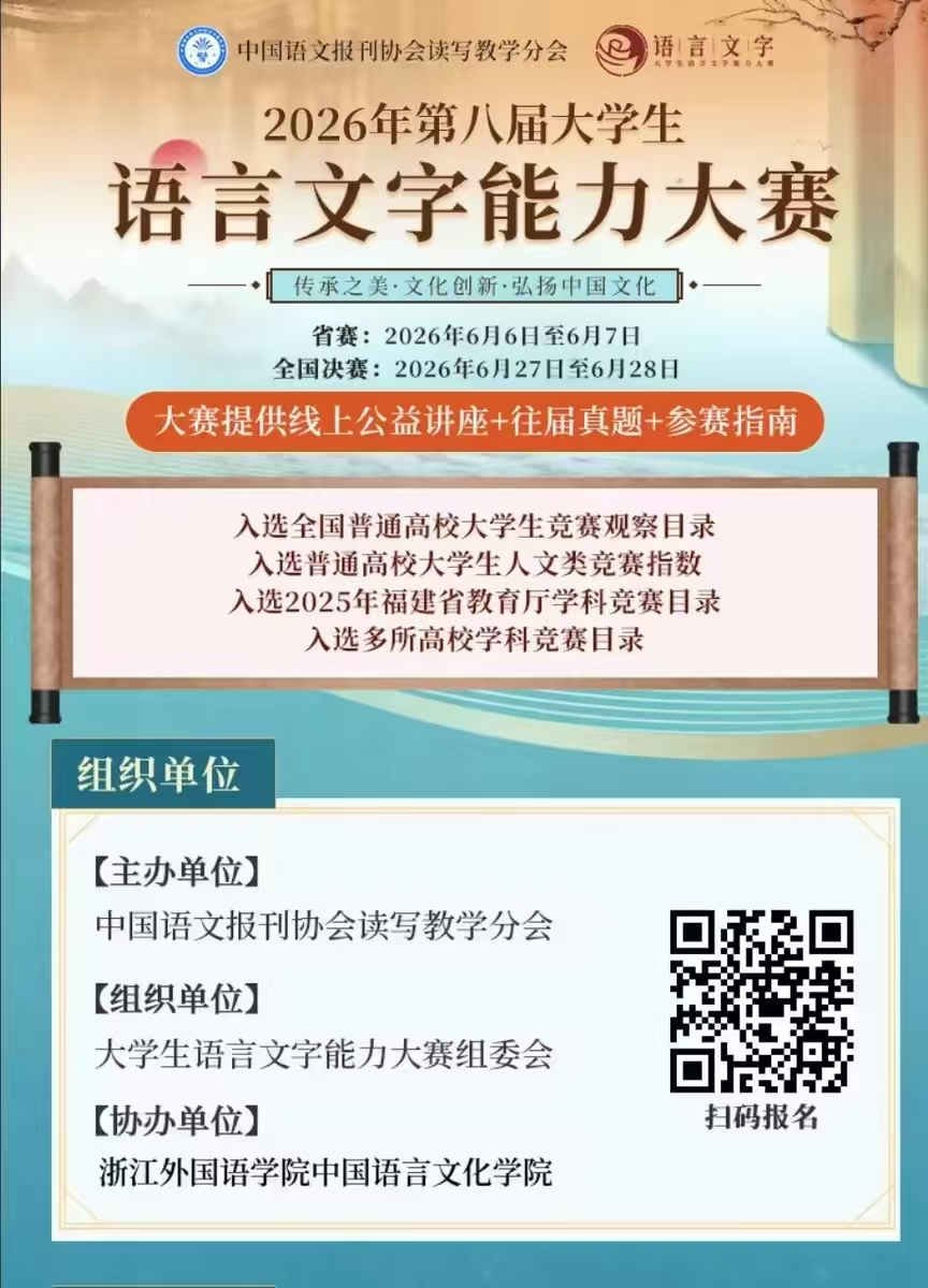 为认真贯彻落实《中华人民共和国国家通用语言文字法》《国家中长期教育改革和发展规划纲要》、国务院办公厅印发的《关于全面加强新时代语言文字工作的意见》。以推广普及和规范使用国家通用语言文字为重点,推进语言文字规范化、标准化、信息化建设。传承弘扬中华优秀语言文化,提高国家通用语言文字规范使用水平。检验大学生的语言文字知识和应用能力,增强大学生规范使用国家通用语言文字的意识,促进语言文字教、学、测协调发展。为铸牢中华民族共同体意识、建设社会主义现代化强国贡献力量。在国家语委咨询委员等专家顾问的指导下,中国语文报刊协会读写教学分会继续面向全国大学生举办“2026年第八届大学生语言文字能力大赛”,欢迎全国学子踊跃参加。