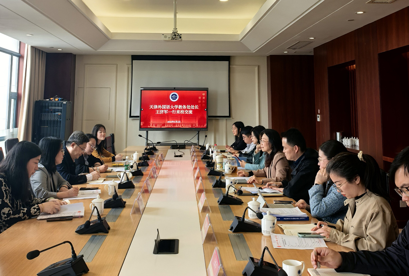 4月2日,天津外国语大学教务处处长王济军一行来校调研交流。副校长、党委委员柴改英出席并主持座谈。